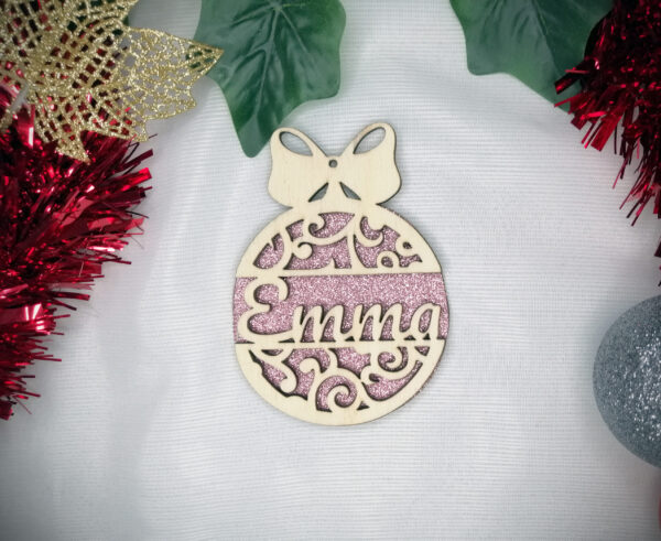 Boule de Noël en bois avec le prénom de votre choix découpé dans le bois et un fond en paillette de plusieurs coloris au choix.