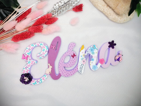 Prénom en bois réalisé sur mesure dans le thème Lilas avec plusieurs styles de décorations possibles.